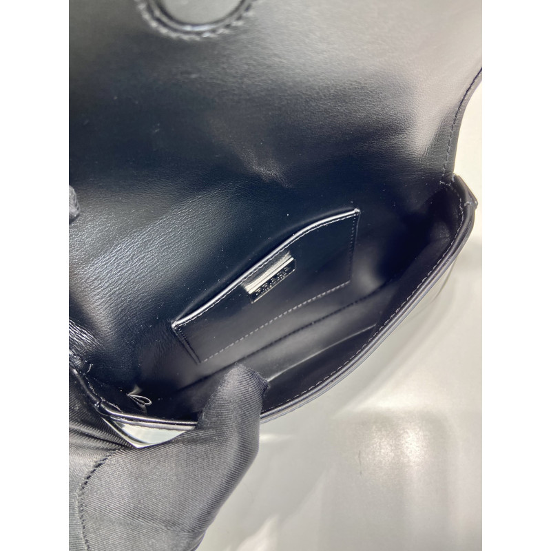 Can be worn around the neck Iconic angled sides create a minimalist silhouette that sits flat against the body. Shiny leather body, detachable adjustable leather shoulder strap, magnetic flap closure, logo print Re-Nylon lining.