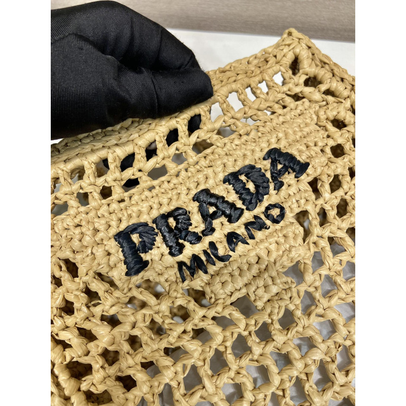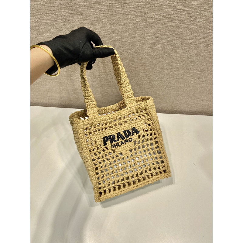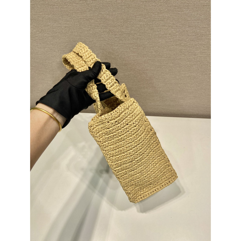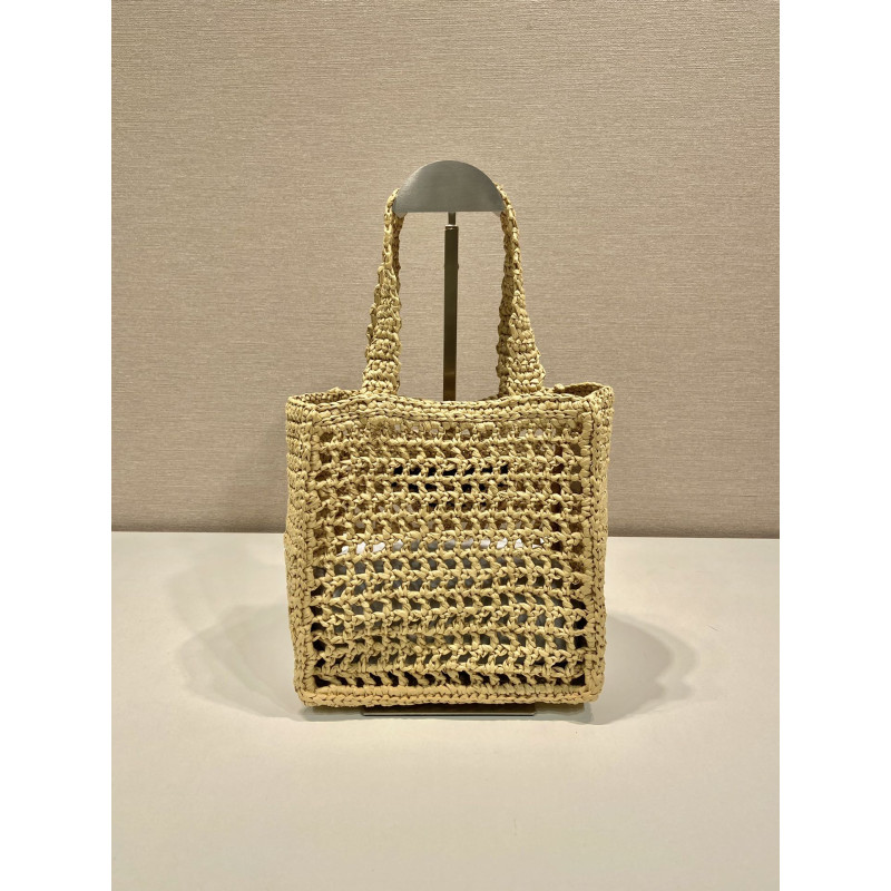 Soft, deconstructed tote bag in raffia-effect yarn, a lightweight and natural material. Embroidered lettering accents the triangular logo on the front, adding a signature touch to the accessory.