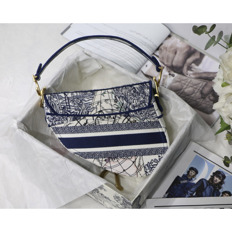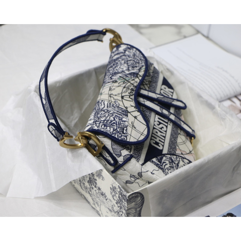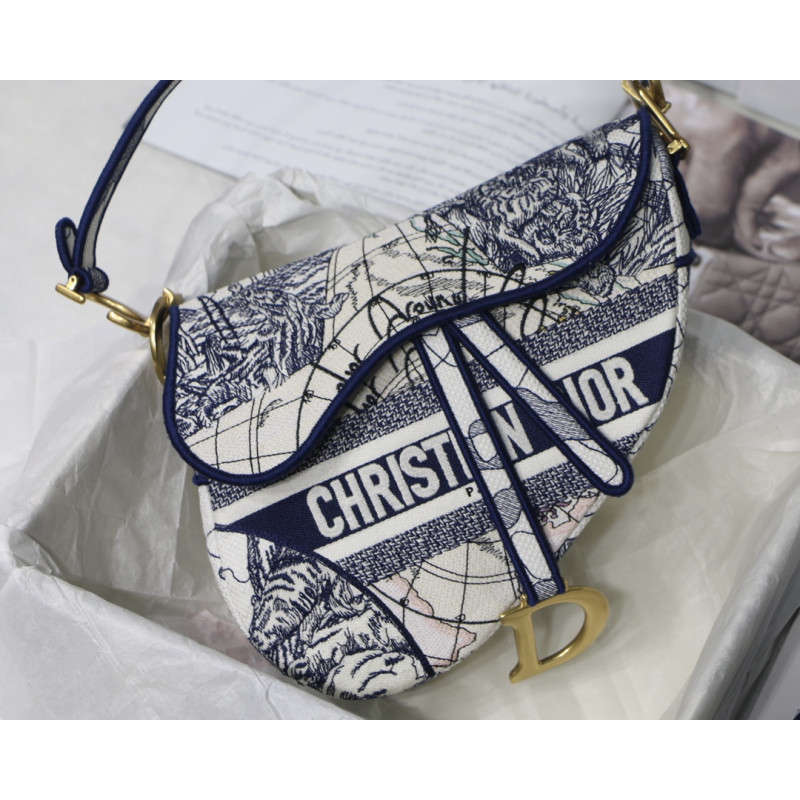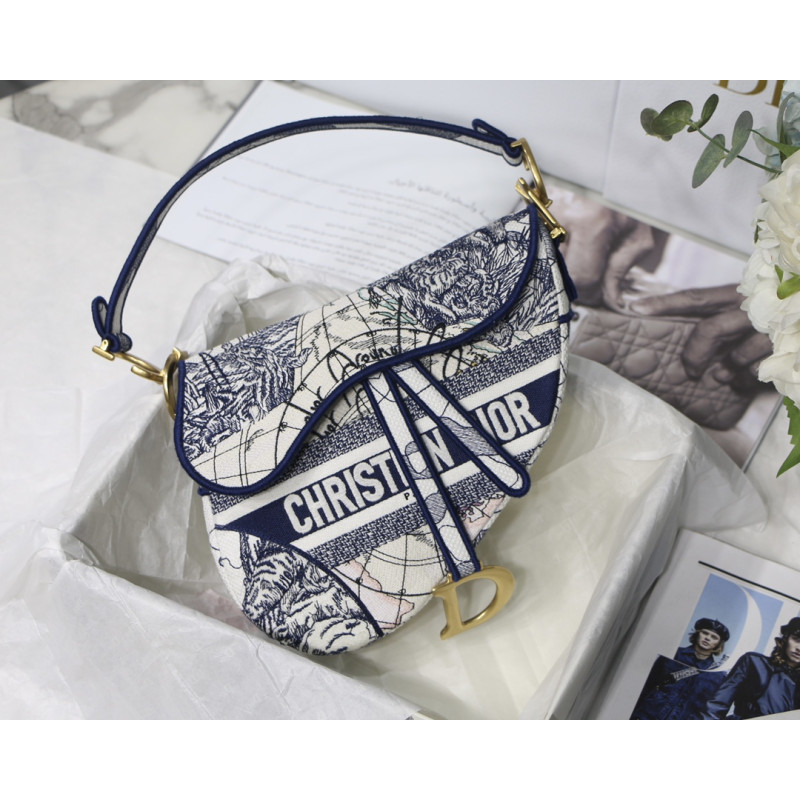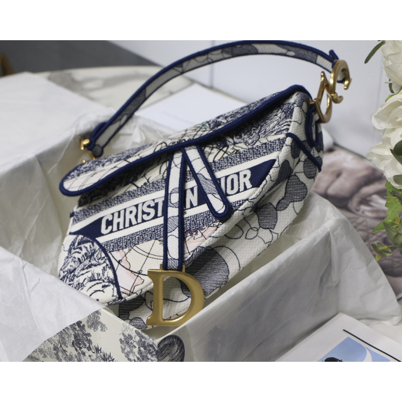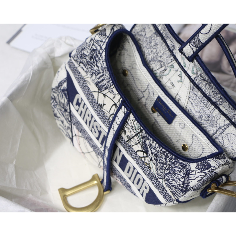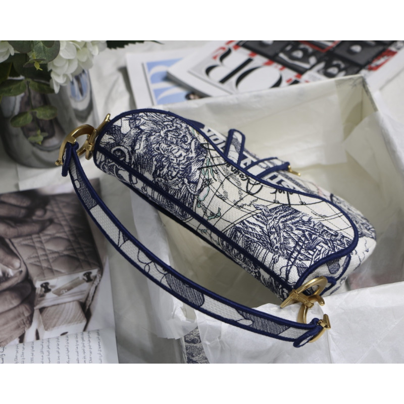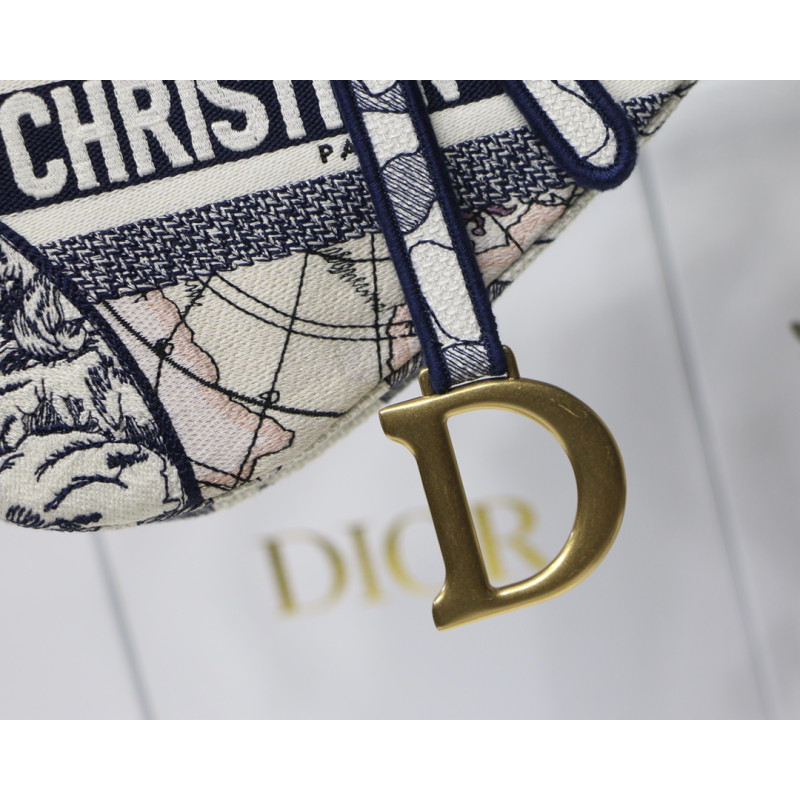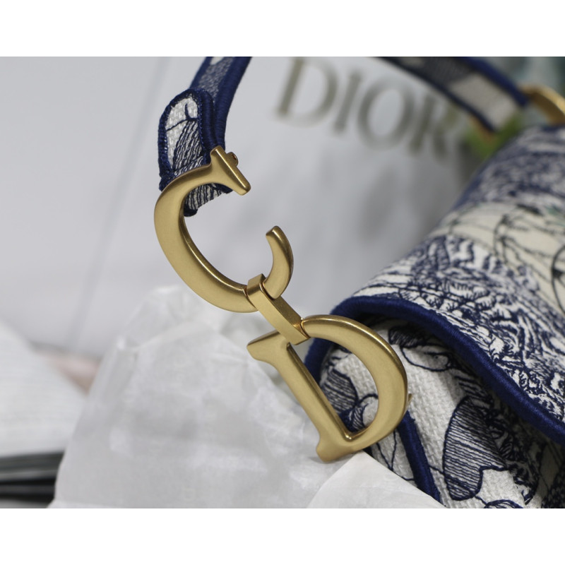 Embroidered with the Toile de Jouy motif, it reveals a saddle flap with a magnetic D-shaped stirrup clasp, as well as a CD signature in antique gold-finish metal on either side of the shoulder strap. This saddle bag has an adjustable and detachable spaghetti strap and can be carried by hand, over the shoulder or across the body.