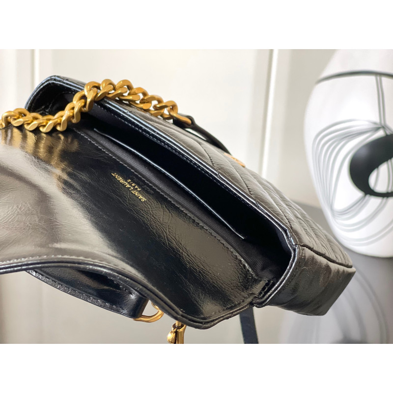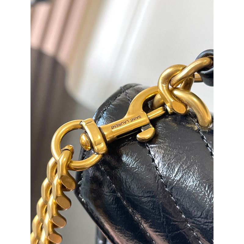 The handbag is adorned with LE CASSANDRE detailing and V-shaped quilted stitching. This versatile piece features a top handle and a detachable leather-and-chain shoulder strap, offering two stylish carrying options.