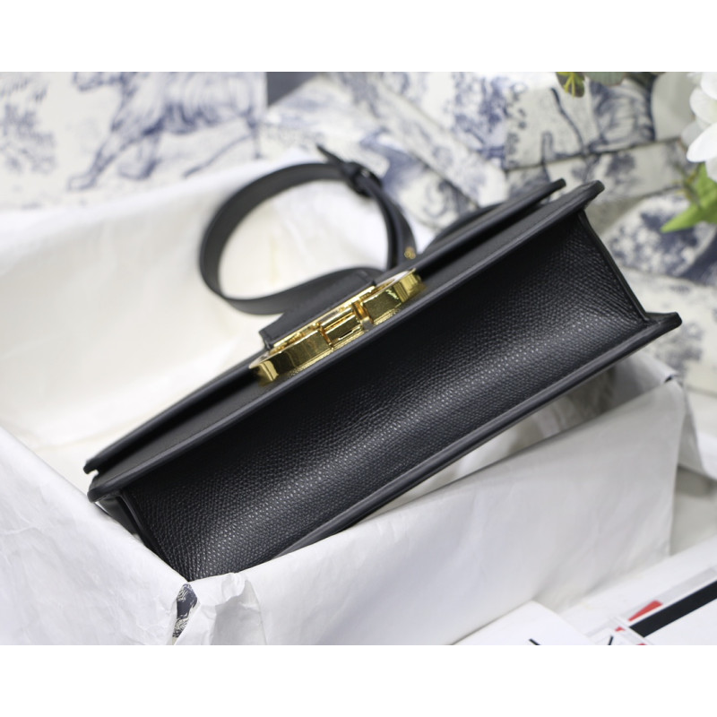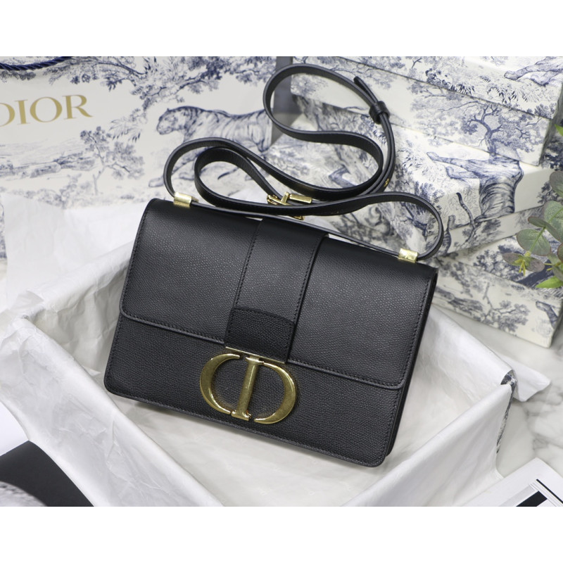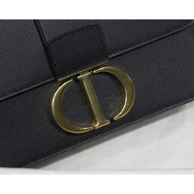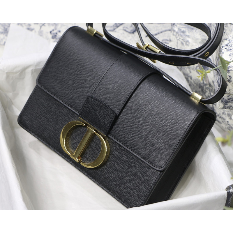 Made of cowhide leather for an elegant and modern look. Flap top with antique gilt metal 'CD' clasp and '30 MONTAIGNE' embossed on the back, adjustable leather shoulder strap to carry it by hand, over the shoulder or across the body.