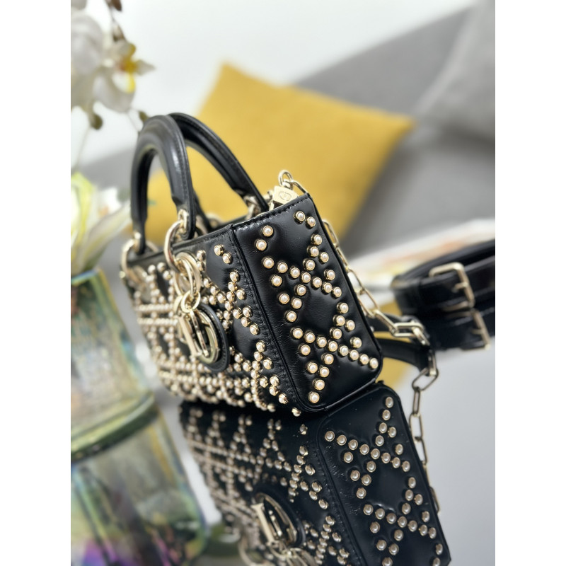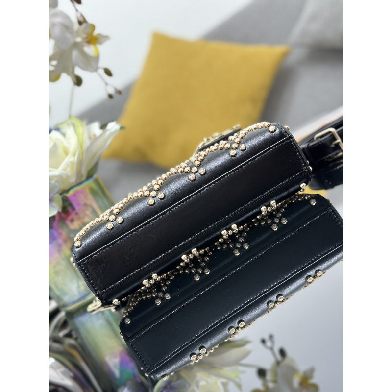 Featuring tonal mini beadwork in lattice patterns, showcasing Dior's exquisite craftsmanship. Accented with light gold-tone metal D.I.O.R. charms for an elegant silhouette. This compact design includes a detachable chain shoulder strap and adjustable leather strap, ideal for everyday versatility.