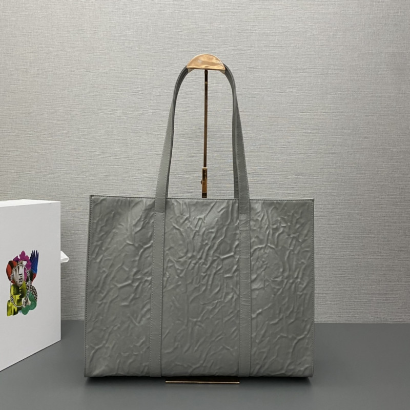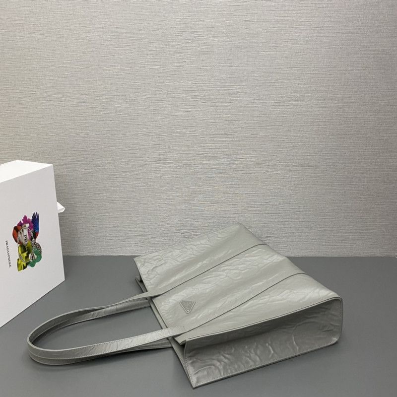 Crafted from natural glossy nappa leather, this tote bag has a casual, everyday appeal. The hand-crafted pleated effect contrasts with the concept of a rigid structure, reinterpreting an everyday item that can be worn casually. Finished with a triangular enameled logo.