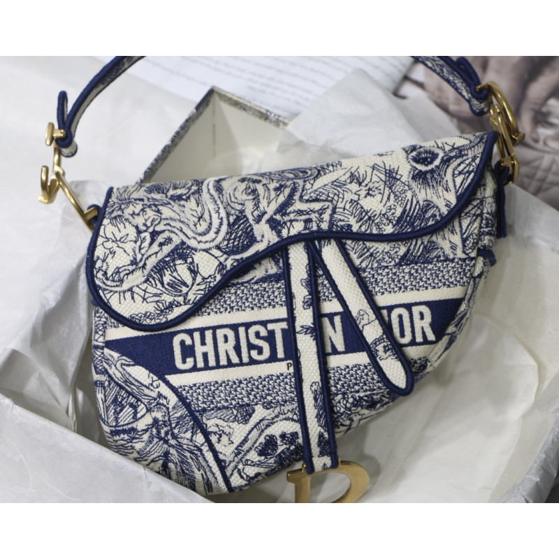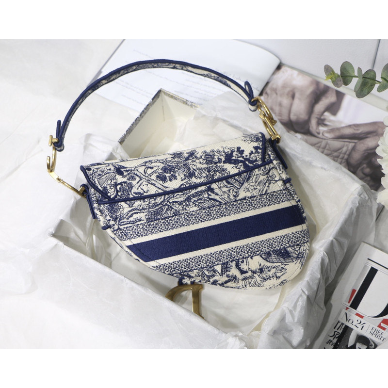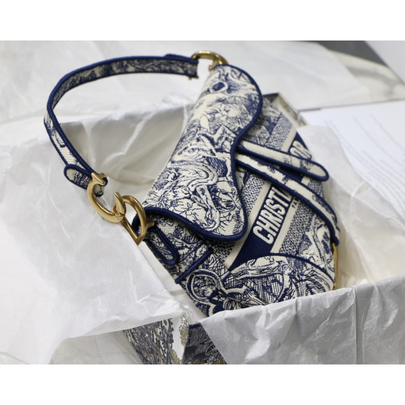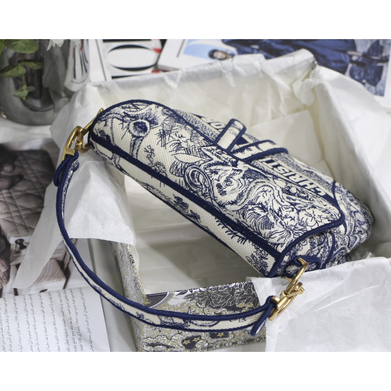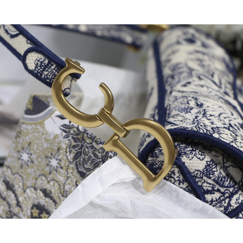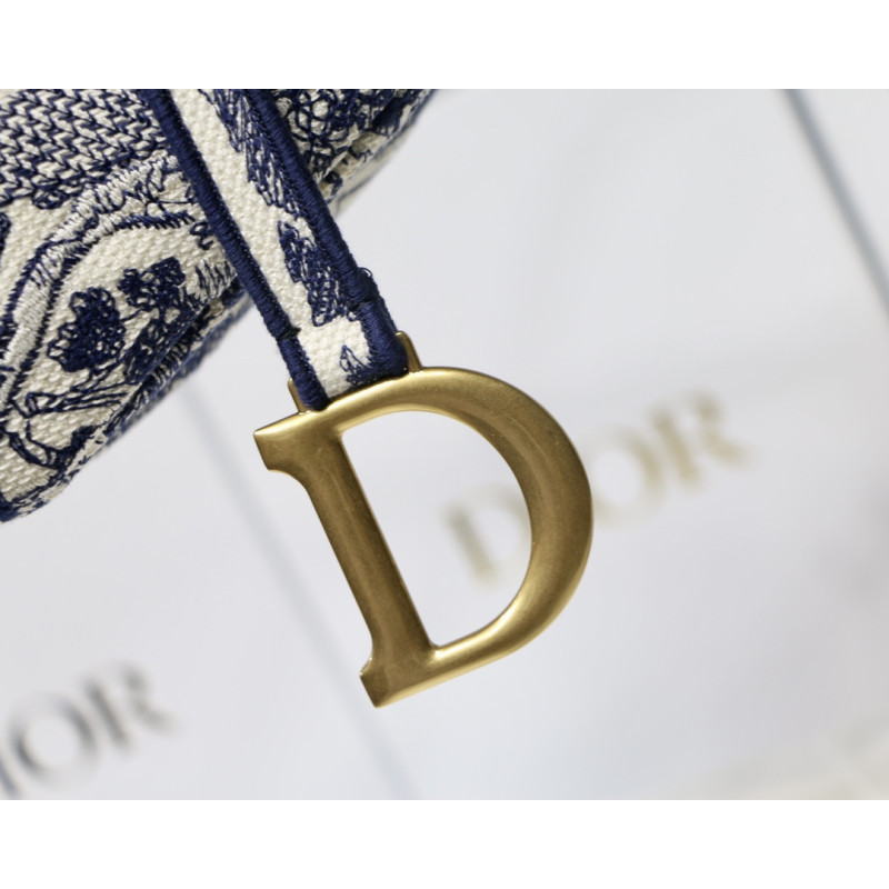 Embroidered with the Toile de Jouy motif, it reveals a saddle flap with a magnetic D-shaped stirrup clasp, as well as a CD signature in antique gold-finish metal on either side of the shoulder strap. This saddle bag has an adjustable and detachable spaghetti strap and can be carried by hand, over the shoulder or across the body.