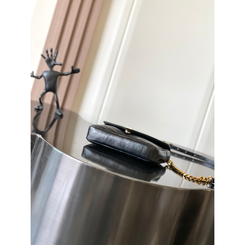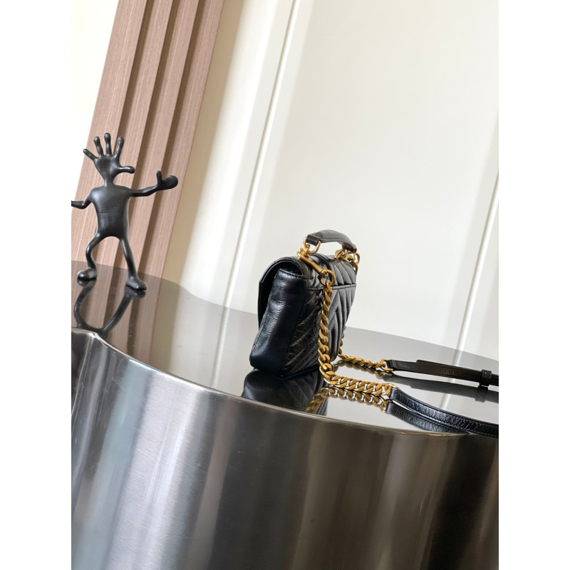 The handbag is adorned with LE CASSANDRE detailing and V-shaped quilted stitching. This versatile piece features a top handle and a detachable leather-and-chain shoulder strap, offering two stylish carrying options.