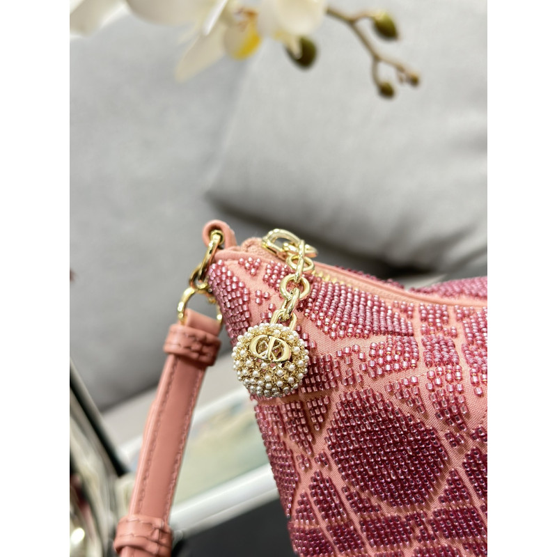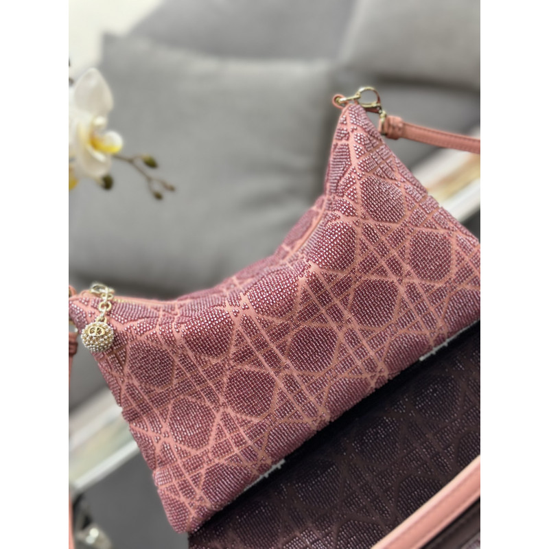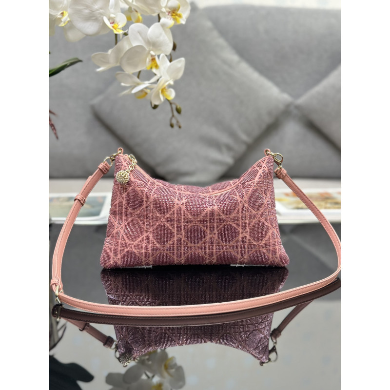 It features a classic cannage pattern. Hand-embroidered with 2mm glass beads. The adjustable and detachable leather spaghetti strap adds sophistication and adds elegance to evening looks.