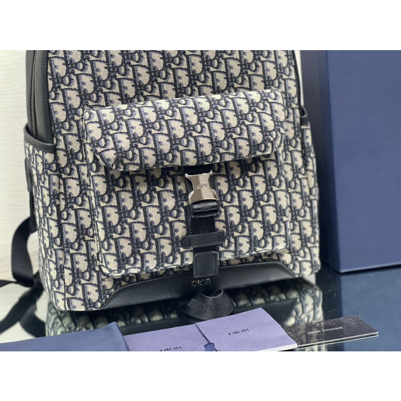 Crafted in Dior Oblique jacquard with black grained calfskin details, it's further accentuated by 'DIOR' leather patches on the sides. The roomy main compartment features a padded front flap pocket with aluminum buckle and two side pockets. Complete with padded shoulder straps and a loop for keys or a D-Touch pouch, this backpack will add the finishing touch to any casual look.​