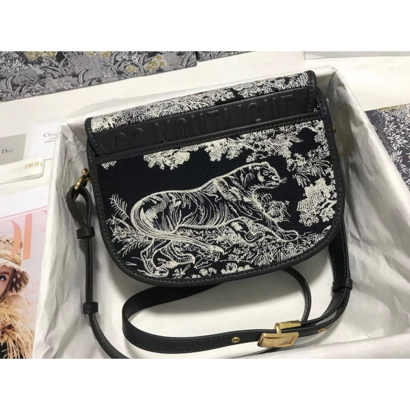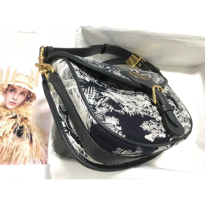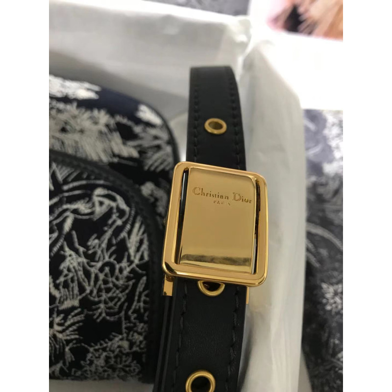 Embroidered Toile de Jouy motif and finished with antique gold-tone hardware. The detachable, adjustable shoulder strap with military buckle fits in the hand, over the shoulder or across the body.