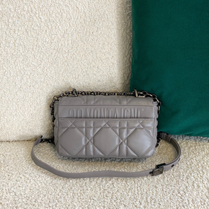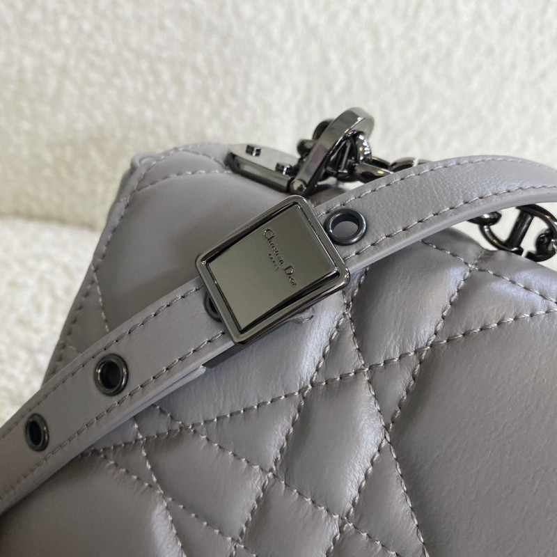 Crafted from calfskin with Cannage stitching. Antique gold-plated metal 'CD' button on the flap, adjustable and detachable chain shoulder strap with 'CD' logo links, can be carried by hand, shoulder or crossbody, and can be matched with different embroidered shoulder straps.